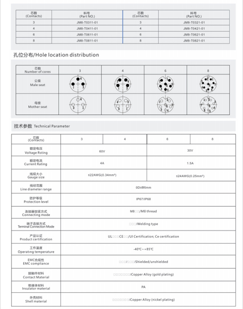 The structure of M8 connector is divided into two parts, namely pins and sockets. The pins are made of copper and fixed to the socket. The socket is usually made of phosphor bronze or brass, which has good conductivity and corrosion resistance. The insertion force between the pins and sockets of M8 connectors is usually large, which can withstand large electrical loads. Imported industrial connectors